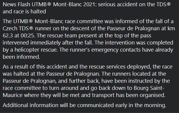 Fatal fall of a Czech runner at UTMB 2021 F1 Deborah F1 Wednesday 25th August 2021 0507 AM REPORT. During the night from Tuesday to Wednesday on the TDS. In the early hours of Tuesday morning rescuers were called out to an indecent involved one of the athletes in the mountainous 147km race with over 9000m of elevation change.